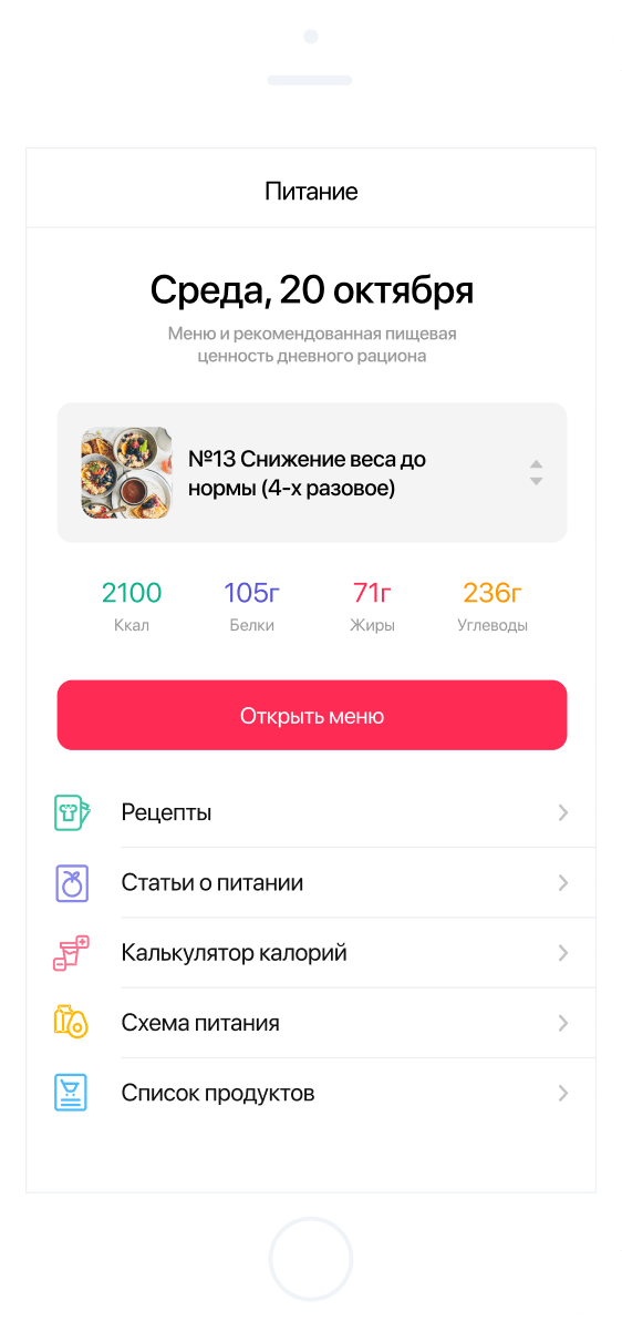 Получите индивидуальное меню из любимых продуктов и с учетом ваших целей, начального веса, состояния здоровья.